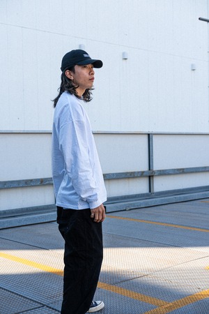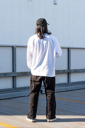 特に袖まわりには余裕をもたせ、肩の落ち感と長めの袖丈でリラックスした印象に仕上げています。袖口はリブを効かせているため、溜まりがきれいに出ます。